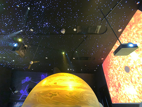 經過絢麗銀河與耀眼流星的美景,我們來到寬闊宏大的太陽系展示空間,這里有八大行星等比例微縮模型,我們仿佛開啟上帝視角,可以走近、觸摸每個星球。模型旁邊的墻壁上,數臺索尼激光工程投影機VPL-F436HZ配合短焦鏡頭VPLL-3007,投影多個大畫面,呈現太陽系綜合信息。